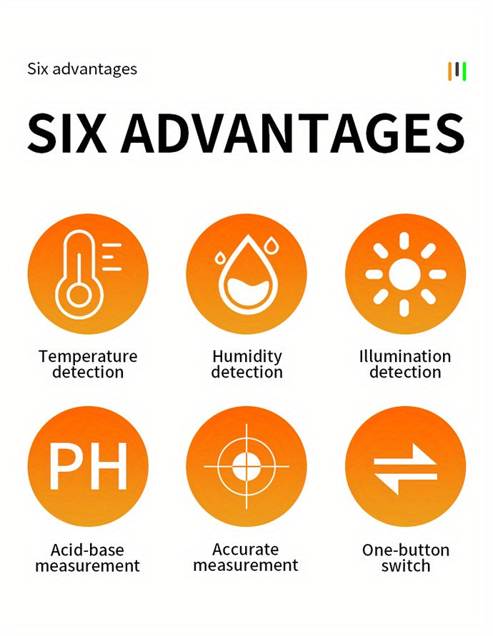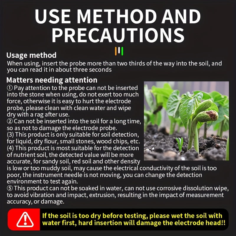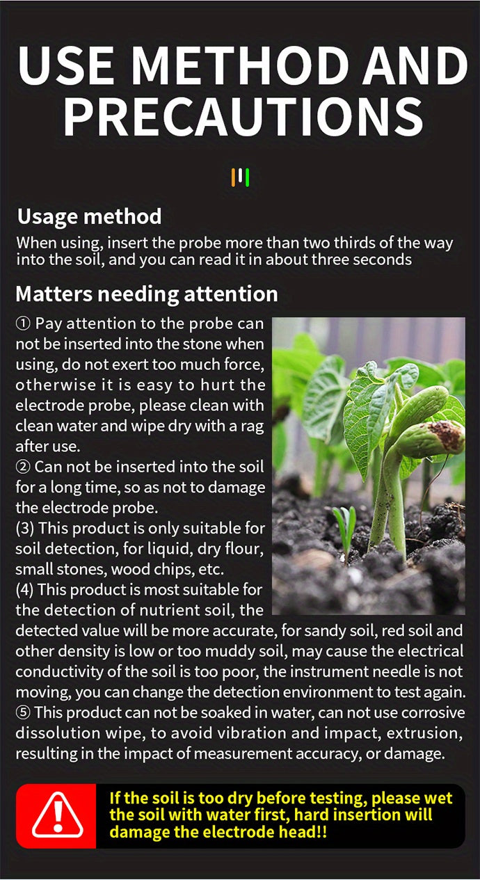 Su diseño compacto y portátil no requiere batería ni electricidad: solo inserta la sonda en la tierra y obtén lecturas instantáneas. Es una herramienta esencial para jardineros, aficionados al cultivo y amantes de las plantas.