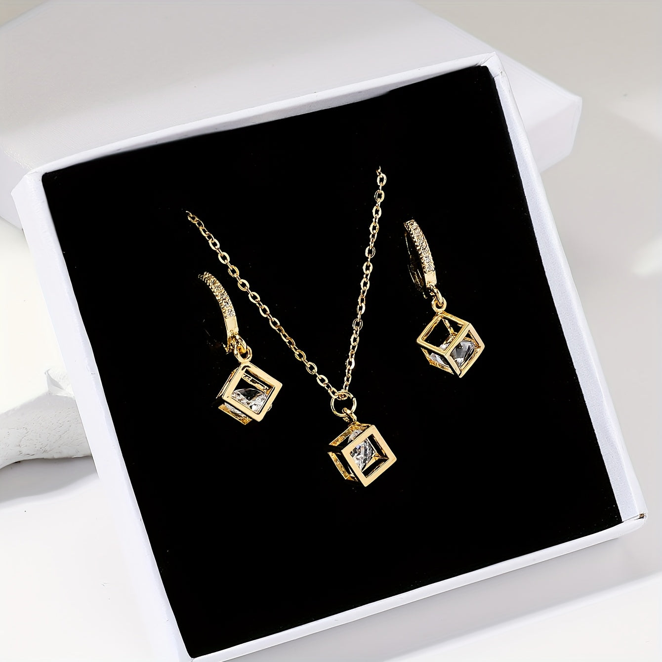 El Zircon Cube es un set de joyería femenina que incluye un collar y aros con colgantes en forma de cubo, incrustados con zirconia cúbica sintética que aporta un brillo sofisticado y moderno. Fabricado en acero inoxidable, este conjunto combina durabilidad, estilo boho y elegancia atemporal.